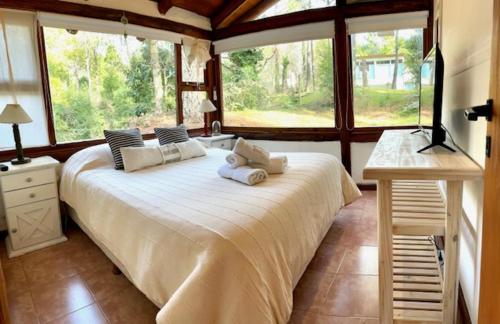 Boasting a garden with swimming pool, Posada del Bosque offers bungalows with fully equipped kitchens and private balconies in Carilo. Free Wi-Fi and breakfast are provided. The beach is 400 metres away and the commercial centre is 250 metres from the property.