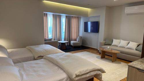 The spacious apartment features a terrace, 1 bedroom, a living room and a well-equipped kitchenette with a minibar. A flat-screen TV is featured.