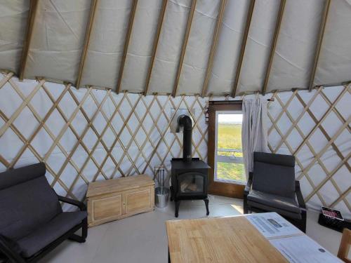 For guests with children, the luxury tent offers outdoor play equipment. Guests can also warm themselves near outdoor fireplace after a day of cycling.