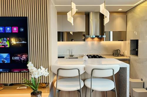 Apto 2 quartos em frente ao Shop Catuai features 2 bedrooms, a fully equipped kitchen with a dishwasher and an oven, a washing machine and 2 bathrooms with a hair dryer. A flat-screen TV is featured. At the accommodation, there is a dressing room for guests to change in.