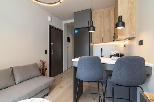 The apartment provides guests with a terrace, city views, a seating area, a flat-screen TV, a fully equipped kitchen with an oven and a toaster, and a private bathroom with shower and a hair dryer. A fridge, a stovetop and kitchenware are also featured, as well as a coffee machine and a kettle. At the apartment complex, all units have bed linen and towels.