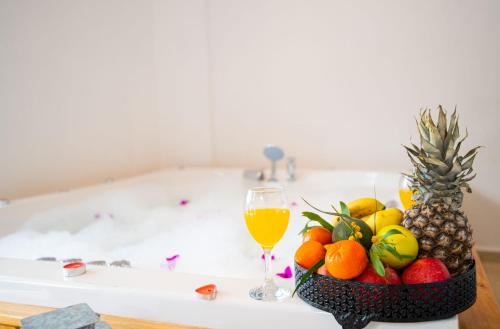 The villa with a terrace and sea views has 2 bedrooms, a living room, a flat-screen TV, an equipped kitchen with a dishwasher and an oven, and 2 bathrooms with a hot tub. The unit is soundproofed and is comprised of a tiled floors as well as a fireplace. The property has an outdoor dining area.